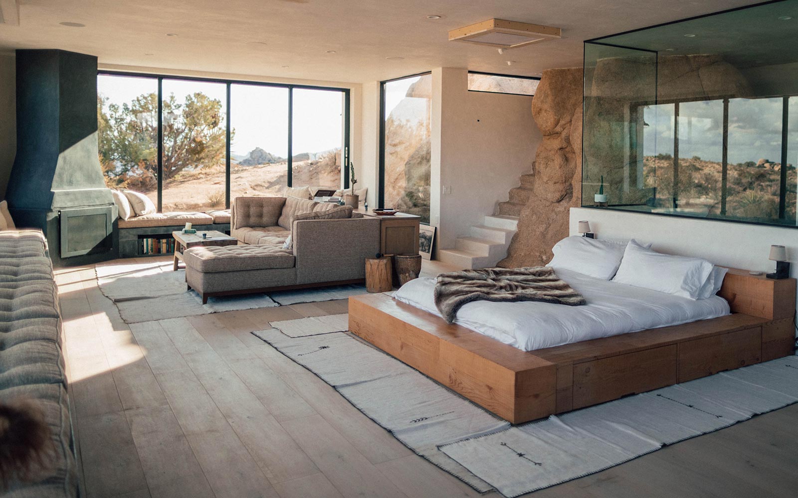 Suite One with private office with a computer with high speed internet, King size bad, access to lounge, bathroom, shower, lounge and shower is sharable with Suite Two, air conditioner